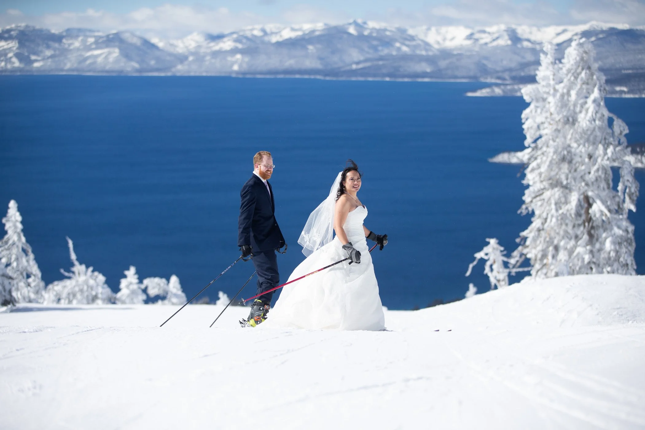 The timing could not have been more perfect. A late season storm had rolled through the Sierra the night before the wedding, dropping nearly two feet of fresh snow on the mountains above Lake Tahoe. By morning, the skies had cleared to that brilliant, cloudless blue that skiers dream about all season. Diamond Peak was blanketed in untouched powder, the lake shimmering below in full view from every run — one of the most spectacular ski backdrops in the world.
